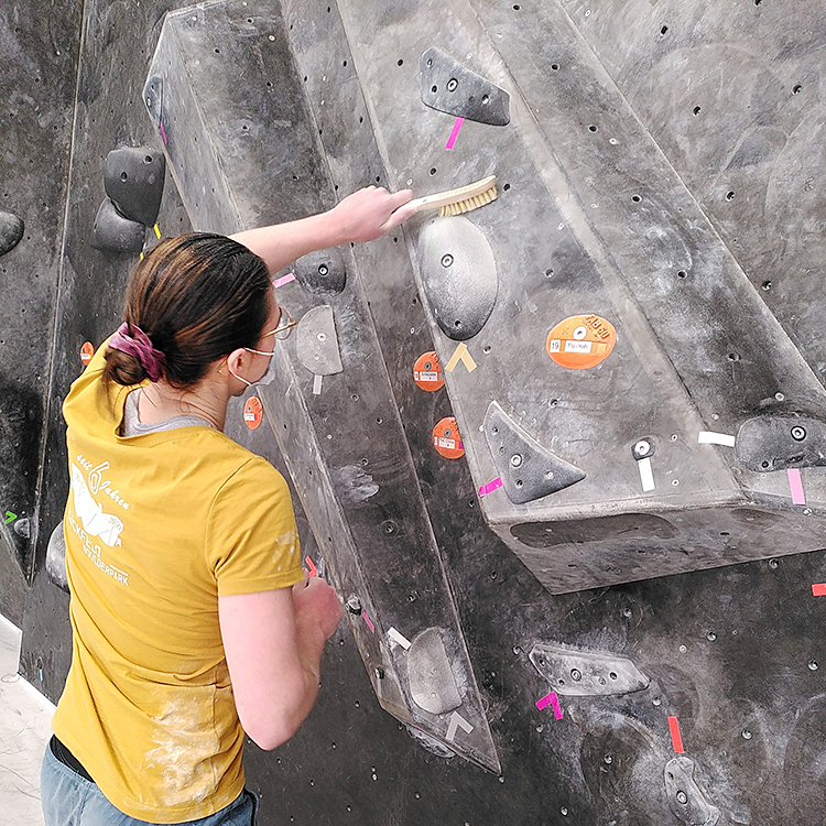 Damit die Boulder ihren urpsrünglichen Grip behalten, hilft es, die Griffe vor jeder Begehung zu bürsten.